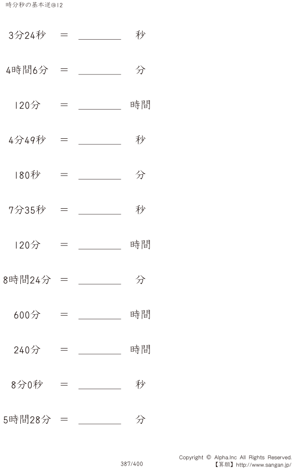 上記のボタンから「時分秒の基本逆@12」の算数数学ドリル・計算ドリル(PDFプリント)がダウンロードできます。個人利用は無料です(家庭以外での配布は有料です)。