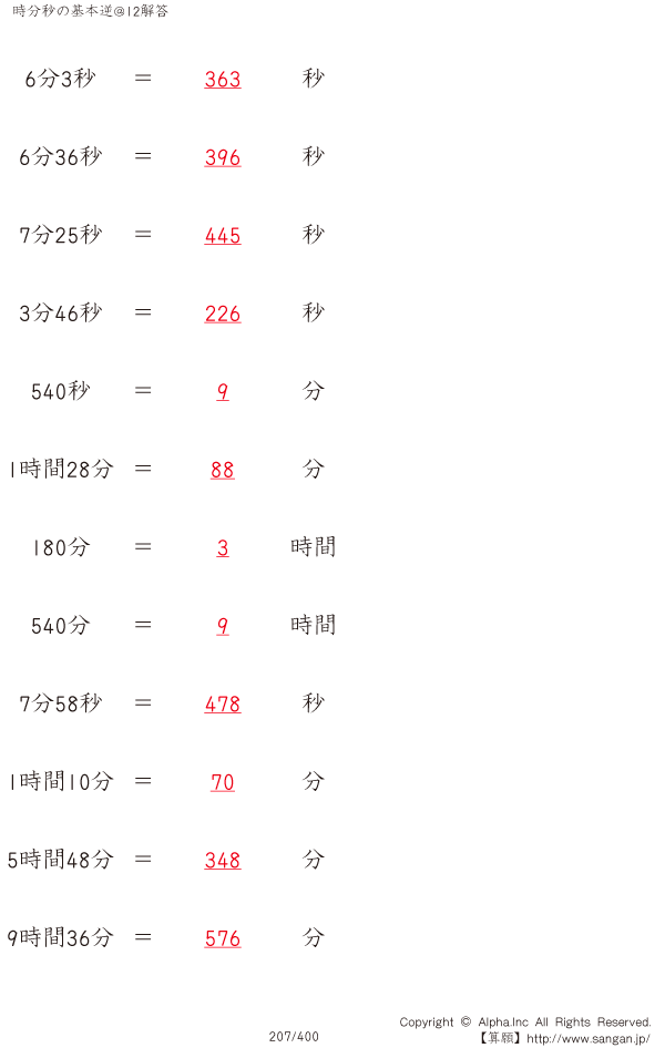 上記のボタンから「時分秒の基本逆@12」の算数数学ドリル・計算ドリル(PDFプリント)がダウンロードできます。個人利用は無料です(家庭以外での配布は有料です)。
