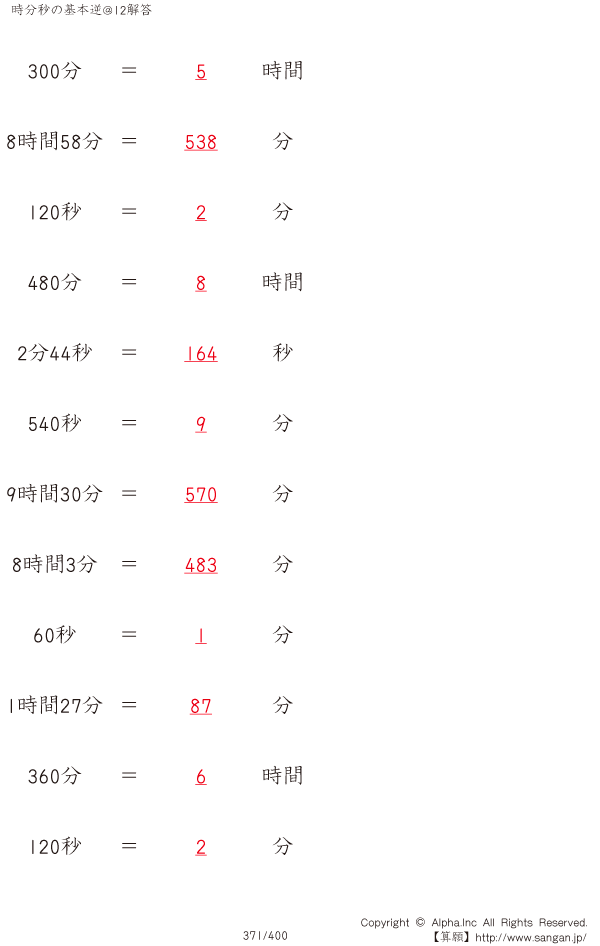 上記のボタンから「時分秒の基本逆@12」の算数数学ドリル・計算ドリル(PDFプリント)がダウンロードできます。個人利用は無料です(家庭以外での配布は有料です)。