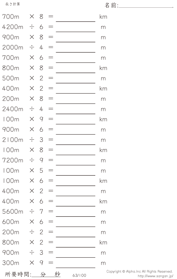 上記のボタンから「km・mの掛け算と割り算」の算数数学ドリル・計算ドリル(PDFプリント)がダウンロードできます。個人利用は無料です(家庭以外での配布は有料です)。