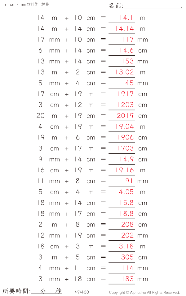 上記のボタンから「m・cm・mmの足し算1」の算数数学ドリル・計算ドリル(PDFプリント)がダウンロードできます。個人利用は無料です(家庭以外での配布は有料です)。