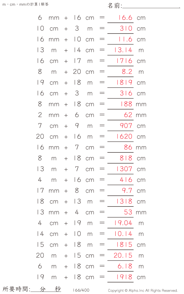 上記のボタンから「m・cm・mmの足し算1」の算数数学ドリル・計算ドリル(PDFプリント)がダウンロードできます。個人利用は無料です(家庭以外での配布は有料です)。