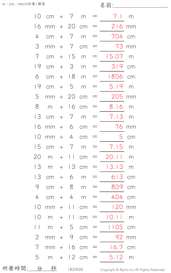 上記のボタンから「m・cm・mmの足し算1」の算数数学ドリル・計算ドリル(PDFプリント)がダウンロードできます。個人利用は無料です(家庭以外での配布は有料です)。