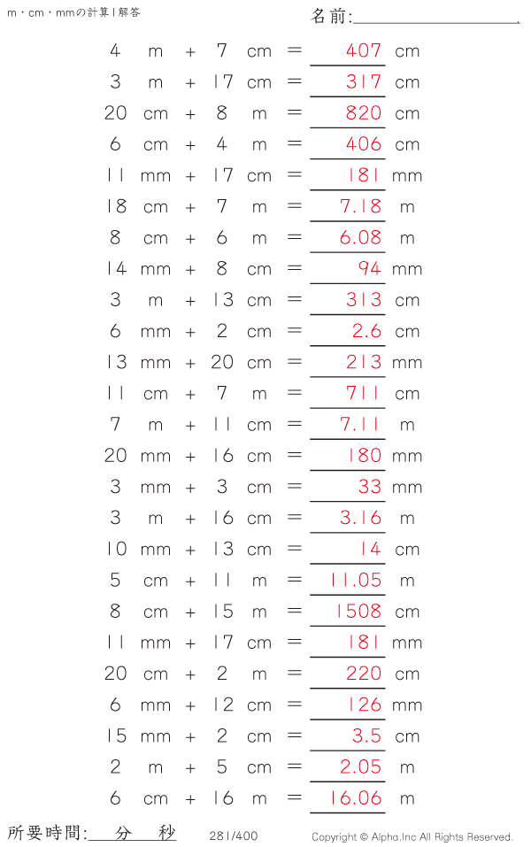 上記のボタンから「m・cm・mmの足し算1」の算数数学ドリル・計算ドリル(PDFプリント)がダウンロードできます。個人利用は無料です(家庭以外での配布は有料です)。