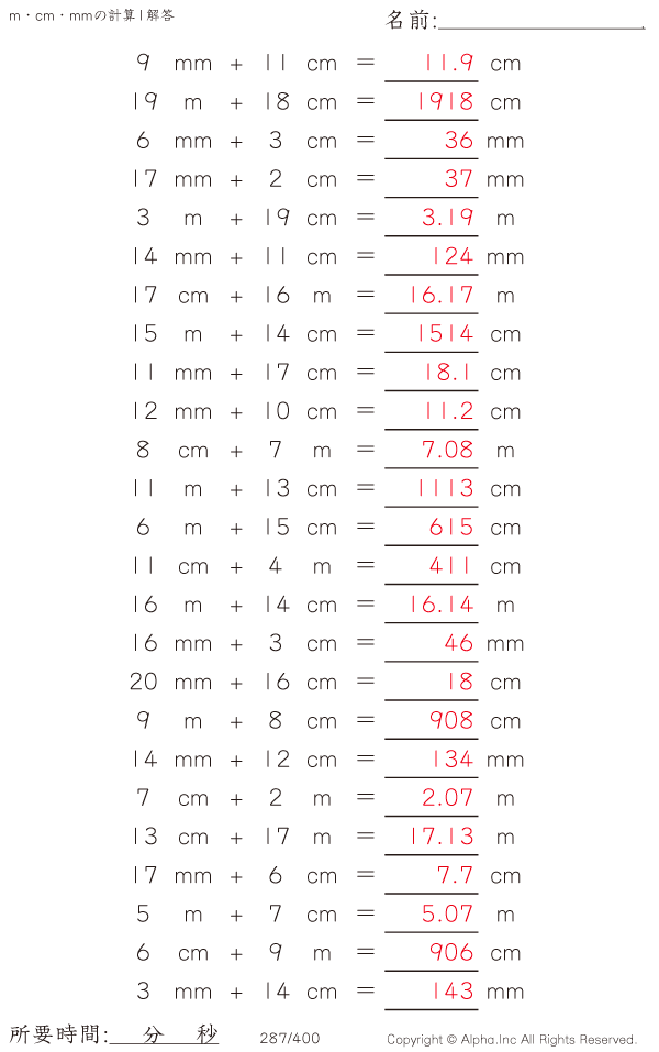 上記のボタンから「m・cm・mmの足し算1」の算数数学ドリル・計算ドリル(PDFプリント)がダウンロードできます。個人利用は無料です(家庭以外での配布は有料です)。