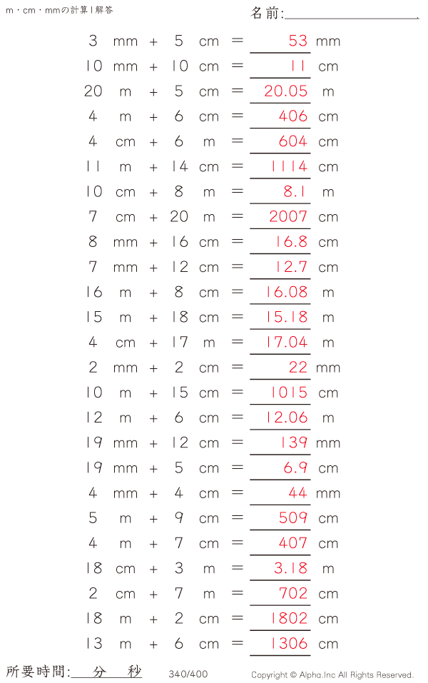 m・cm・mmの足し算1 [解答]340/400
