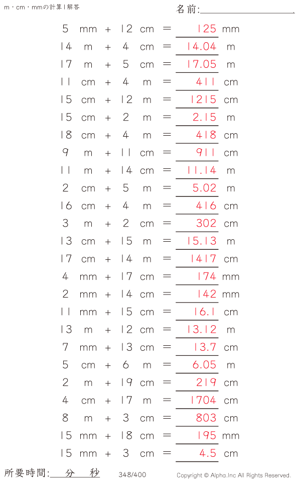 上記のボタンから「m・cm・mmの足し算1」の算数数学ドリル・計算ドリル(PDFプリント)がダウンロードできます。個人利用は無料です(家庭以外での配布は有料です)。