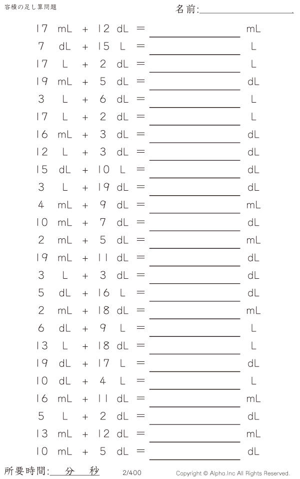 上記のボタンから「容積の足し算」の算数数学ドリル・計算ドリル(PDFプリント)がダウンロードできます。個人利用は無料です(家庭以外での配布は有料です)。