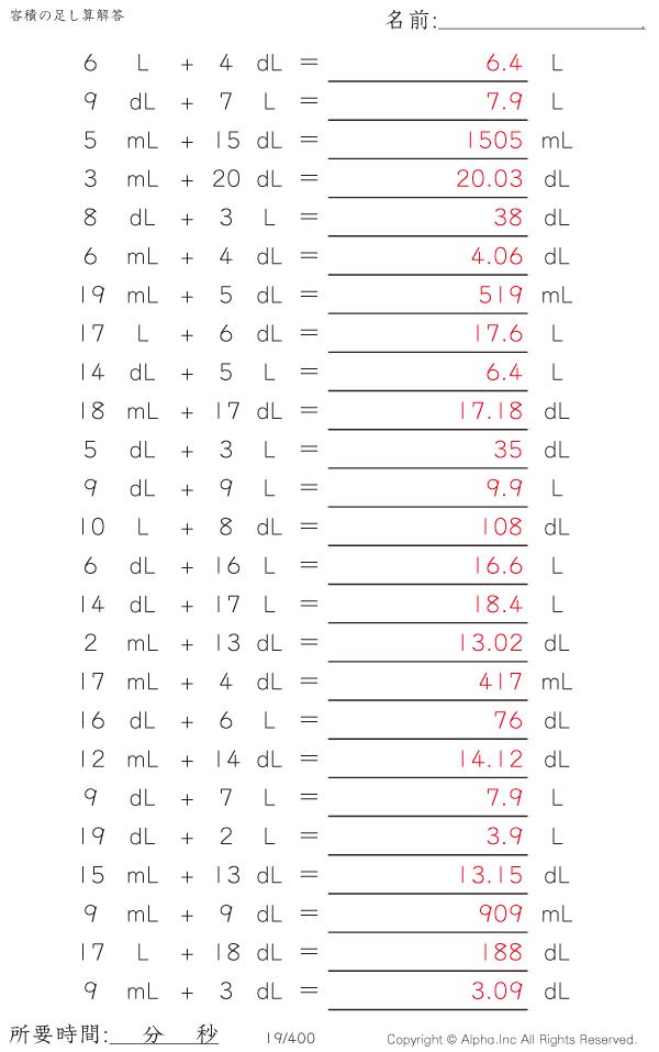 上記のボタンから「容積の足し算」の算数数学ドリル・計算ドリル(PDFプリント)がダウンロードできます。個人利用は無料です(家庭以外での配布は有料です)。