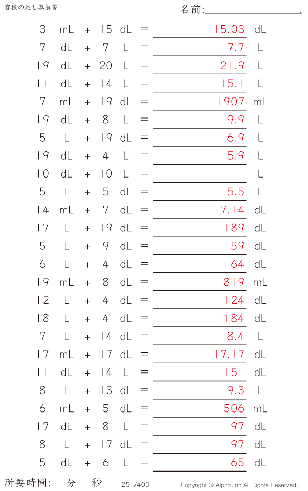 上記のボタンから「容積の足し算」の算数数学ドリル・計算ドリル(PDFプリント)がダウンロードできます。個人利用は無料です(家庭以外での配布は有料です)。