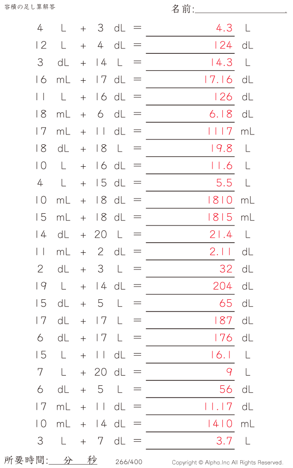 上記のボタンから「容積の足し算」の算数数学ドリル・計算ドリル(PDFプリント)がダウンロードできます。個人利用は無料です(家庭以外での配布は有料です)。
