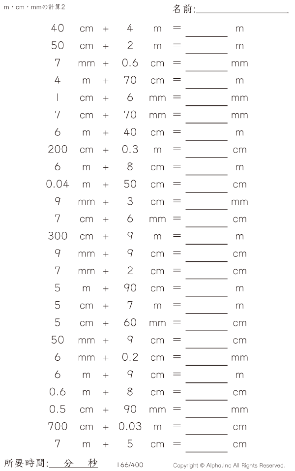上記のボタンから「m・cm・mmの足し算2」の算数数学ドリル・計算ドリル(PDFプリント)がダウンロードできます。個人利用は無料です(家庭以外での配布は有料です)。