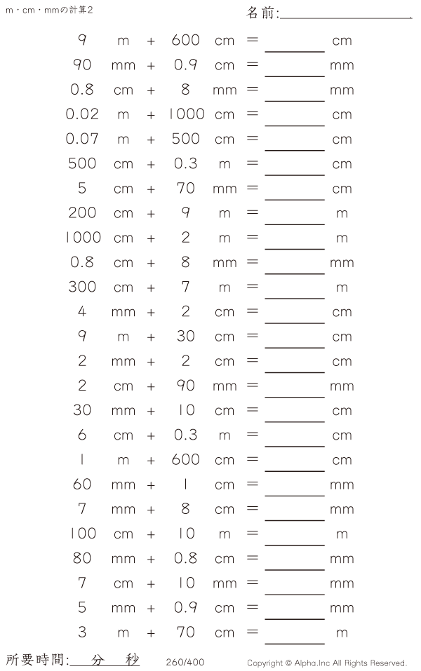 上記のボタンから「m・cm・mmの足し算2」の算数数学ドリル・計算ドリル(PDFプリント)がダウンロードできます。個人利用は無料です(家庭以外での配布は有料です)。