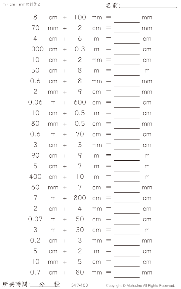 上記のボタンから「m・cm・mmの足し算2」の算数数学ドリル・計算ドリル(PDFプリント)がダウンロードできます。個人利用は無料です(家庭以外での配布は有料です)。