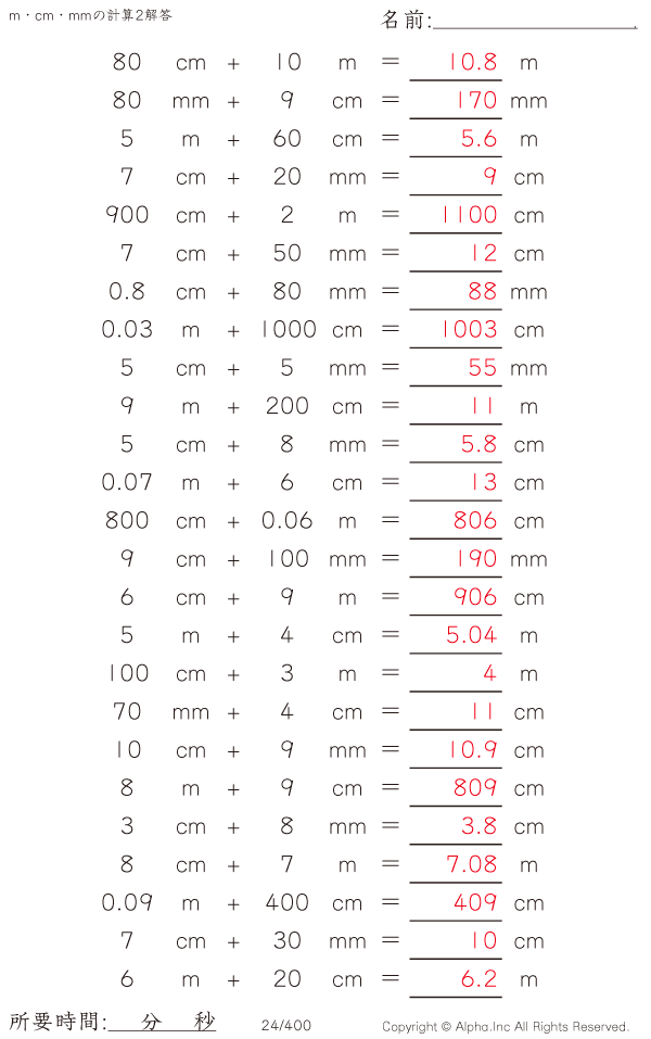 上記のボタンから「m・cm・mmの足し算2」の算数数学ドリル・計算ドリル(PDFプリント)がダウンロードできます。個人利用は無料です(家庭以外での配布は有料です)。