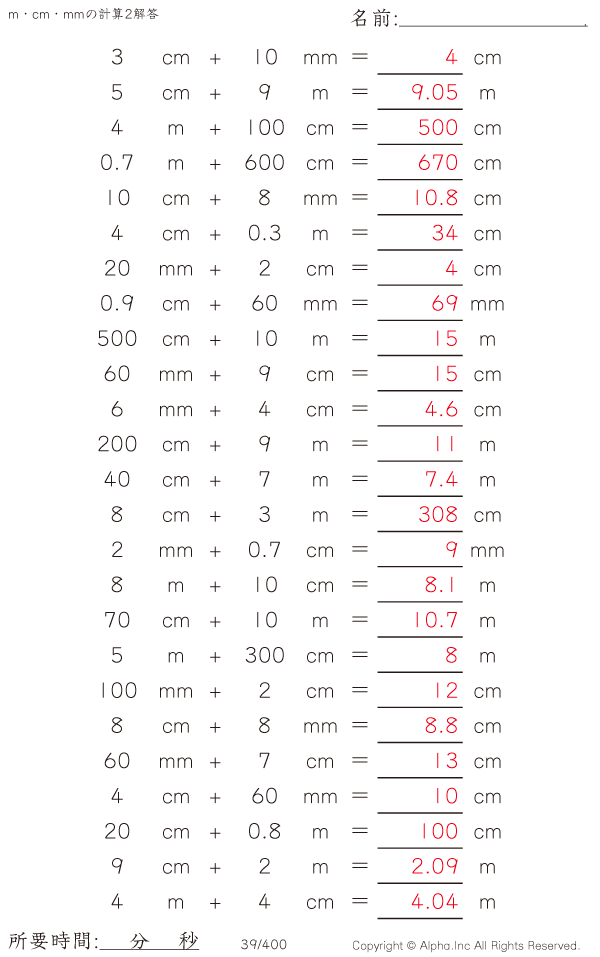 上記のボタンから「m・cm・mmの足し算2」の算数数学ドリル・計算ドリル(PDFプリント)がダウンロードできます。個人利用は無料です(家庭以外での配布は有料です)。