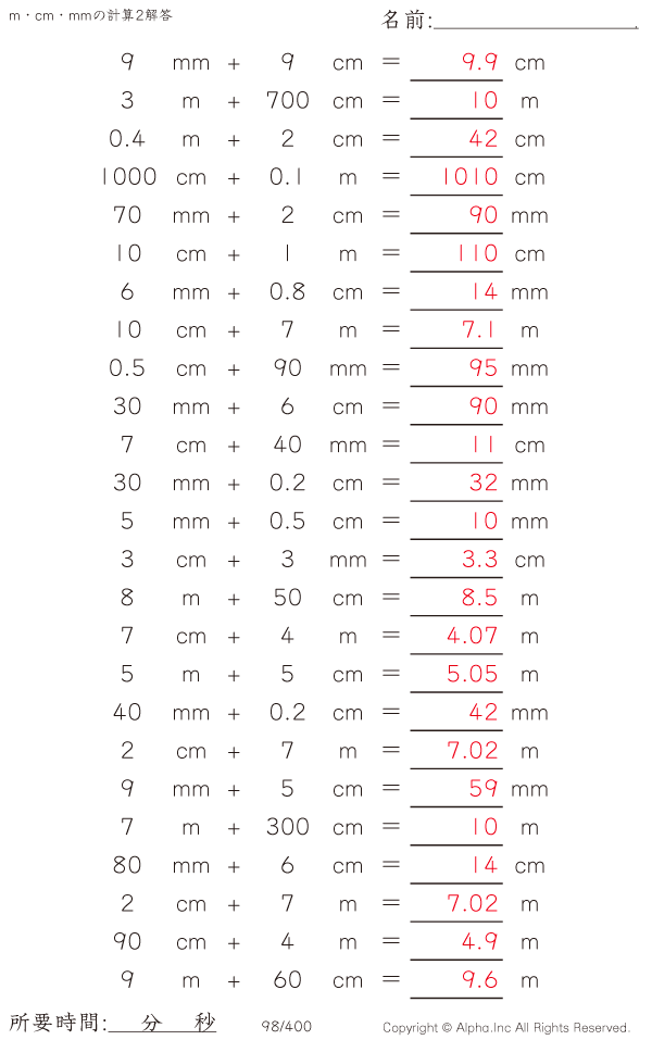 上記のボタンから「m・cm・mmの足し算2」の算数数学ドリル・計算ドリル(PDFプリント)がダウンロードできます。個人利用は無料です(家庭以外での配布は有料です)。