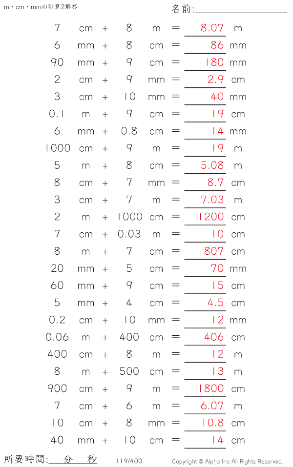 上記のボタンから「m・cm・mmの足し算2」の算数数学ドリル・計算ドリル(PDFプリント)がダウンロードできます。個人利用は無料です(家庭以外での配布は有料です)。