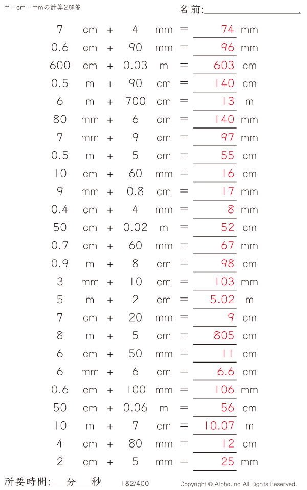 上記のボタンから「m・cm・mmの足し算2」の算数数学ドリル・計算ドリル(PDFプリント)がダウンロードできます。個人利用は無料です(家庭以外での配布は有料です)。