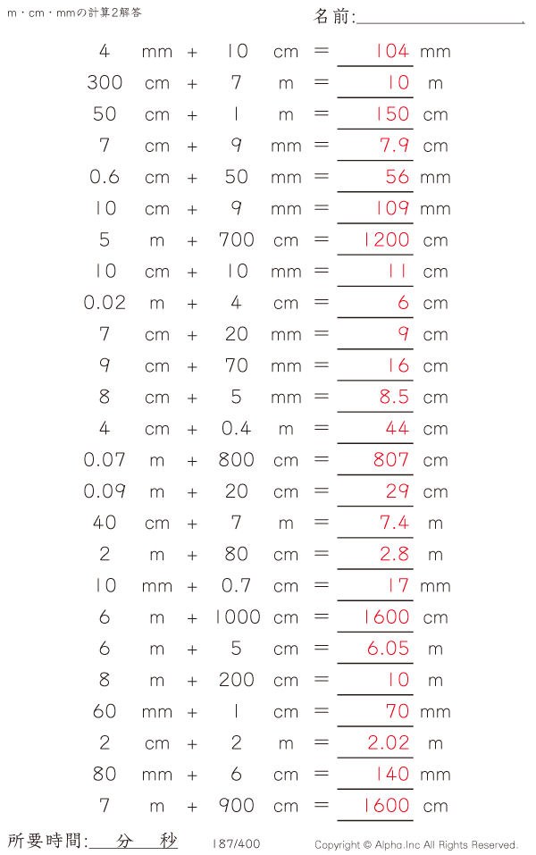 上記のボタンから「m・cm・mmの足し算2」の算数数学ドリル・計算ドリル(PDFプリント)がダウンロードできます。個人利用は無料です(家庭以外での配布は有料です)。