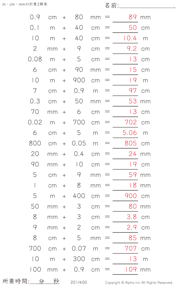 上記のボタンから「m・cm・mmの足し算2」の算数数学ドリル・計算ドリル(PDFプリント)がダウンロードできます。個人利用は無料です(家庭以外での配布は有料です)。