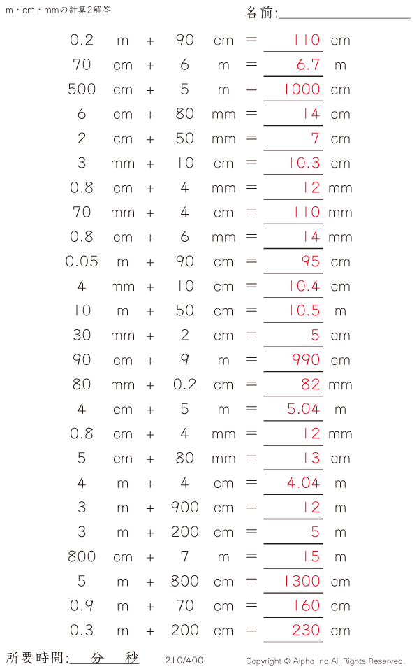 上記のボタンから「m・cm・mmの足し算2」の算数数学ドリル・計算ドリル(PDFプリント)がダウンロードできます。個人利用は無料です(家庭以外での配布は有料です)。