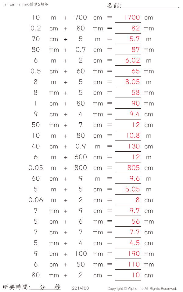 上記のボタンから「m・cm・mmの足し算2」の算数数学ドリル・計算ドリル(PDFプリント)がダウンロードできます。個人利用は無料です(家庭以外での配布は有料です)。