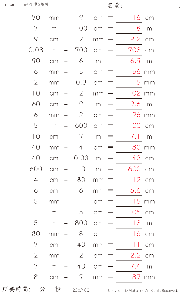 上記のボタンから「m・cm・mmの足し算2」の算数数学ドリル・計算ドリル(PDFプリント)がダウンロードできます。個人利用は無料です(家庭以外での配布は有料です)。