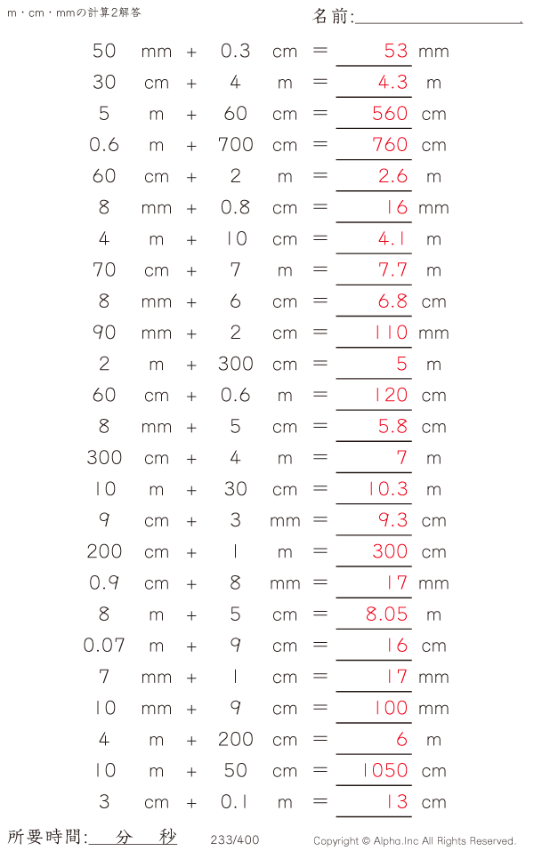 上記のボタンから「m・cm・mmの足し算2」の算数数学ドリル・計算ドリル(PDFプリント)がダウンロードできます。個人利用は無料です(家庭以外での配布は有料です)。