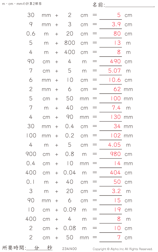 上記のボタンから「m・cm・mmの足し算2」の算数数学ドリル・計算ドリル(PDFプリント)がダウンロードできます。個人利用は無料です(家庭以外での配布は有料です)。