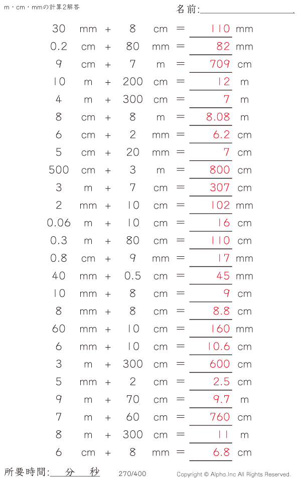 上記のボタンから「m・cm・mmの足し算2」の算数数学ドリル・計算ドリル(PDFプリント)がダウンロードできます。個人利用は無料です(家庭以外での配布は有料です)。