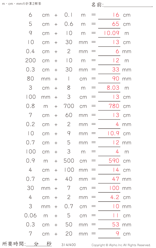 上記のボタンから「m・cm・mmの足し算2」の算数数学ドリル・計算ドリル(PDFプリント)がダウンロードできます。個人利用は無料です(家庭以外での配布は有料です)。