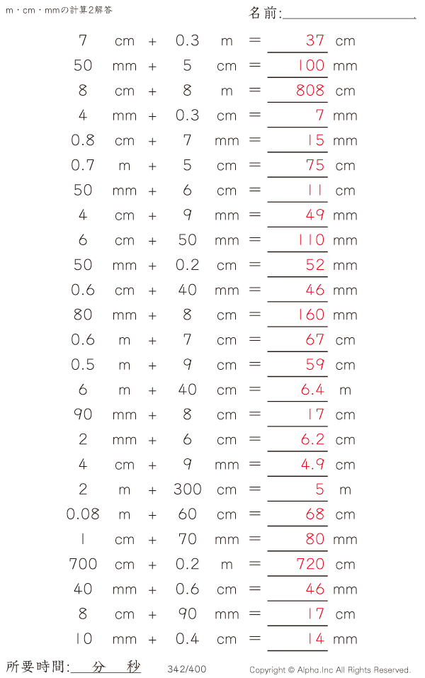上記のボタンから「m・cm・mmの足し算2」の算数数学ドリル・計算ドリル(PDFプリント)がダウンロードできます。個人利用は無料です(家庭以外での配布は有料です)。