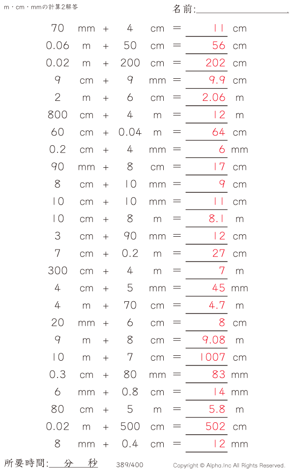 上記のボタンから「m・cm・mmの足し算2」の算数数学ドリル・計算ドリル(PDFプリント)がダウンロードできます。個人利用は無料です(家庭以外での配布は有料です)。
