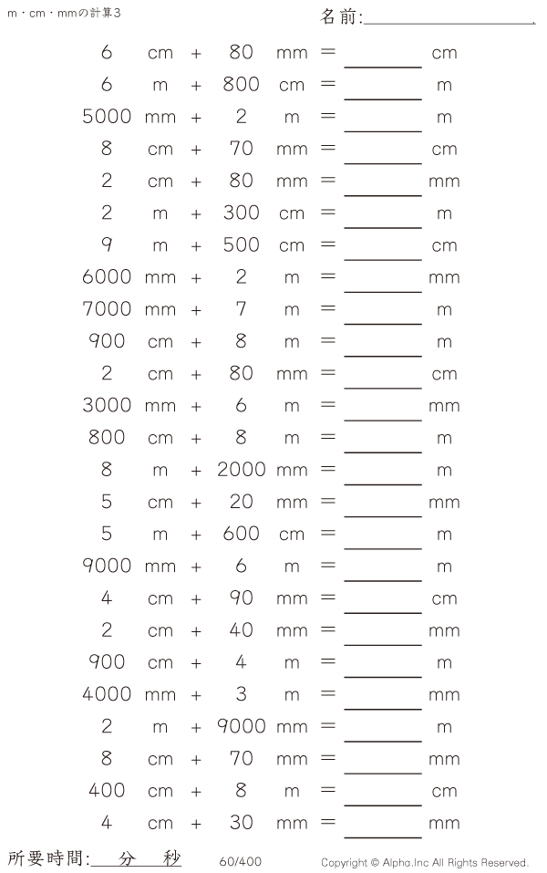 上記のボタンから「m・cm・mmの足し算3」の算数数学ドリル・計算ドリル(PDFプリント)がダウンロードできます。個人利用は無料です(家庭以外での配布は有料です)。