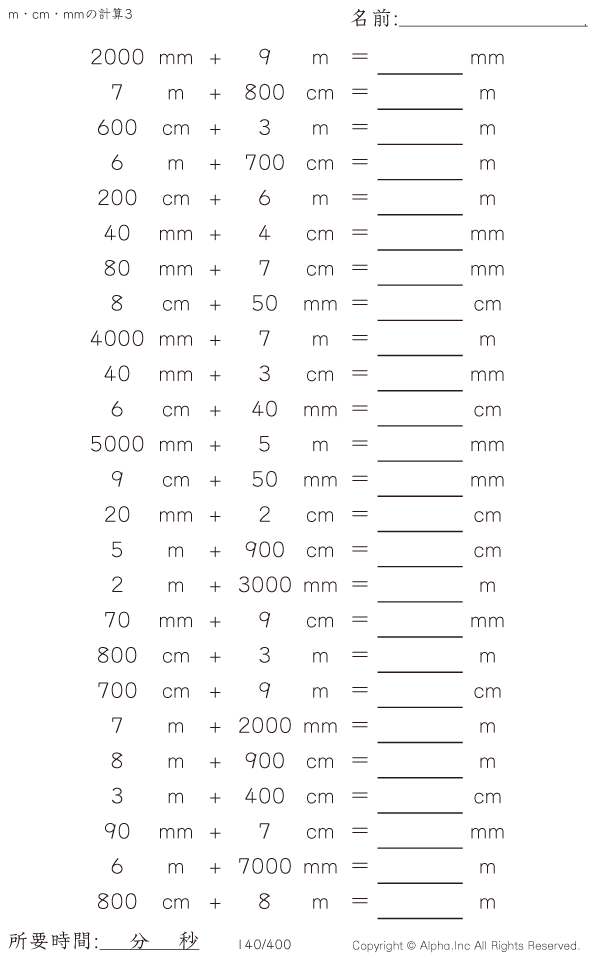 上記のボタンから「m・cm・mmの足し算3」の算数数学ドリル・計算ドリル(PDFプリント)がダウンロードできます。個人利用は無料です(家庭以外での配布は有料です)。