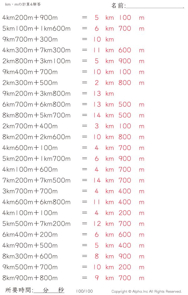 km・mの足し算 [解答]100/170
