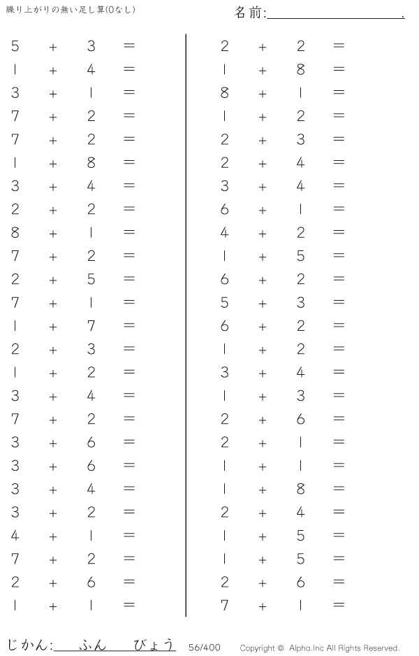 上記のボタンから「繰り上がりの無い足し算(0なし)」の算数数学ドリル・計算ドリル(PDFプリント)がダウンロードできます。個人利用は無料です(家庭以外での配布は有料です)。
