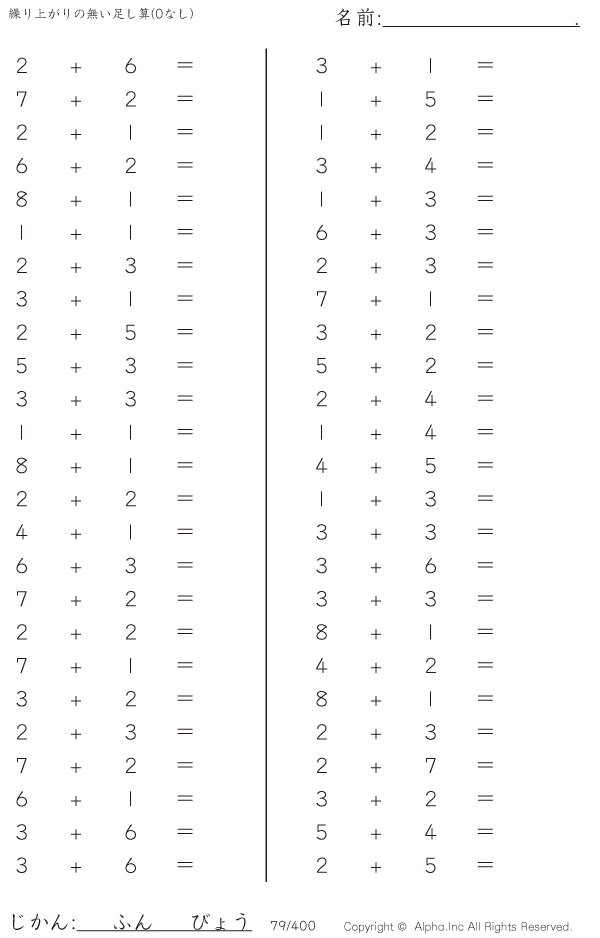 上記のボタンから「繰り上がりの無い足し算(0なし)」の算数数学ドリル・計算ドリル(PDFプリント)がダウンロードできます。個人利用は無料です(家庭以外での配布は有料です)。