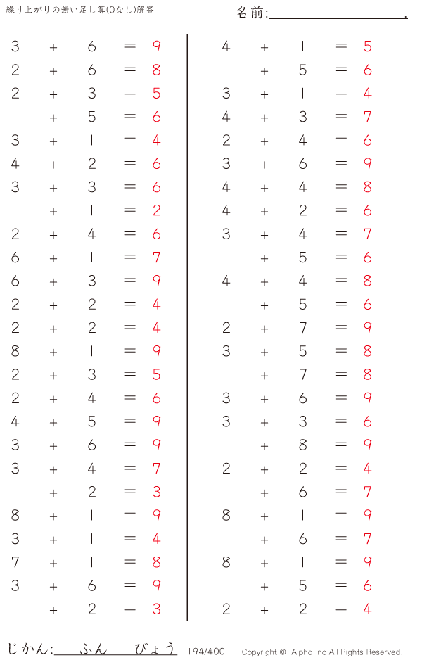 繰り上がりの無い足し算(0なし) [解答]194/400