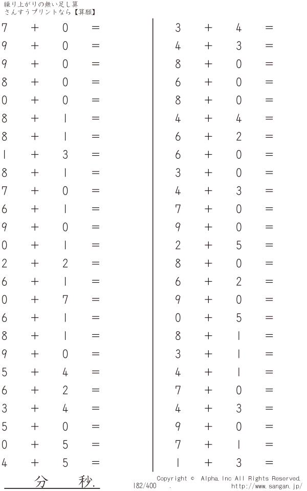 上記のボタンから「繰り上がりの無い足し算」の算数数学ドリル・計算ドリル(PDFプリント)がダウンロードできます。個人利用は無料です(家庭以外での配布は有料です)。