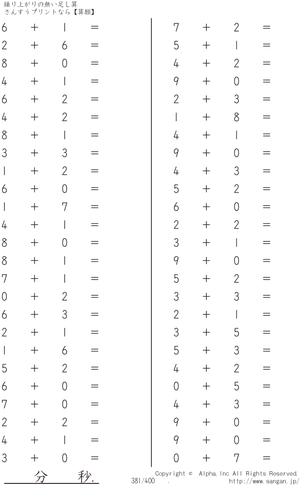 上記のボタンから「繰り上がりの無い足し算」の算数数学ドリル・計算ドリル(PDFプリント)がダウンロードできます。個人利用は無料です(家庭以外での配布は有料です)。