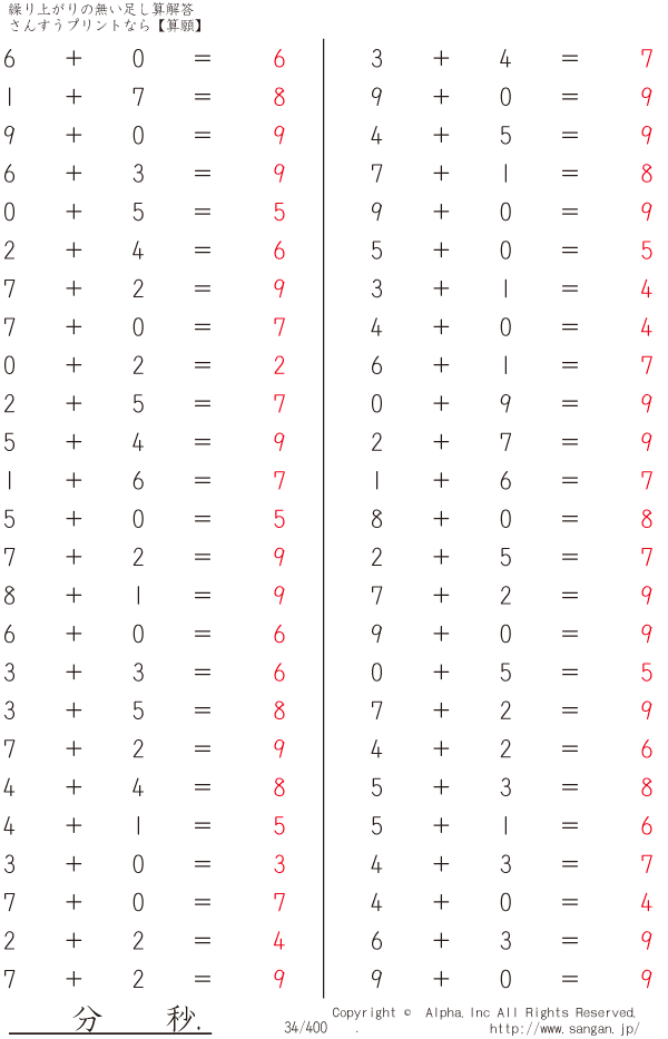 上記のボタンから「繰り上がりの無い足し算」の算数数学ドリル・計算ドリル(PDFプリント)がダウンロードできます。個人利用は無料です(家庭以外での配布は有料です)。