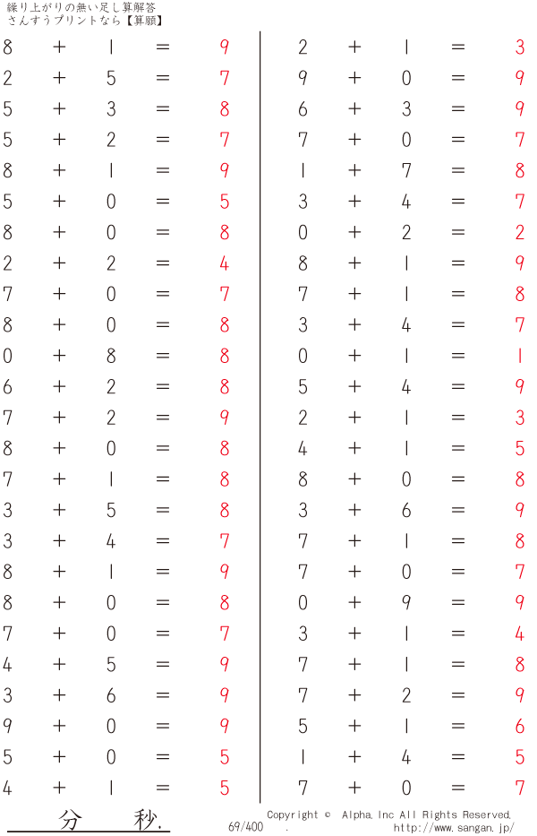 上記のボタンから「繰り上がりの無い足し算」の算数数学ドリル・計算ドリル(PDFプリント)がダウンロードできます。個人利用は無料です(家庭以外での配布は有料です)。