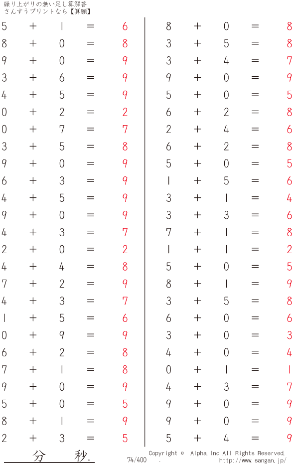 上記のボタンから「繰り上がりの無い足し算」の算数数学ドリル・計算ドリル(PDFプリント)がダウンロードできます。個人利用は無料です(家庭以外での配布は有料です)。