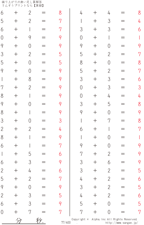 上記のボタンから「繰り上がりの無い足し算」の算数数学ドリル・計算ドリル(PDFプリント)がダウンロードできます。個人利用は無料です(家庭以外での配布は有料です)。