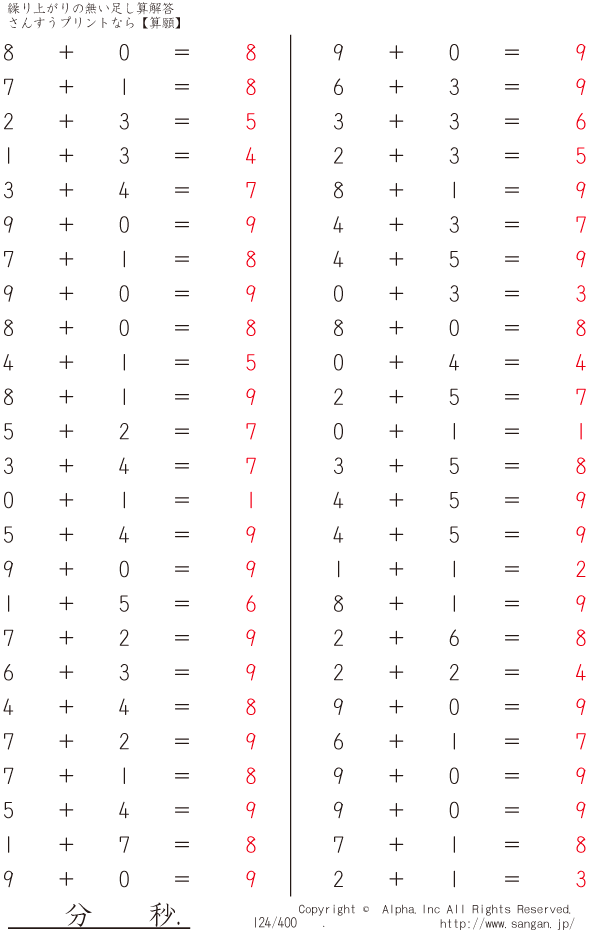 上記のボタンから「繰り上がりの無い足し算」の算数数学ドリル・計算ドリル(PDFプリント)がダウンロードできます。個人利用は無料です(家庭以外での配布は有料です)。