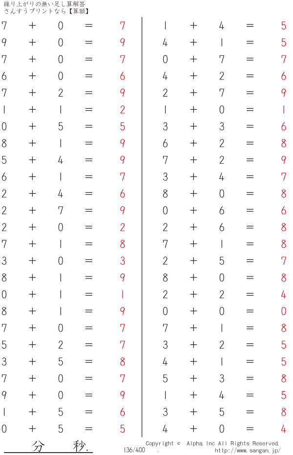 上記のボタンから「繰り上がりの無い足し算」の算数数学ドリル・計算ドリル(PDFプリント)がダウンロードできます。個人利用は無料です(家庭以外での配布は有料です)。