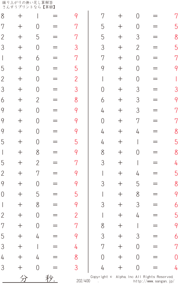 上記のボタンから「繰り上がりの無い足し算」の算数数学ドリル・計算ドリル(PDFプリント)がダウンロードできます。個人利用は無料です(家庭以外での配布は有料です)。