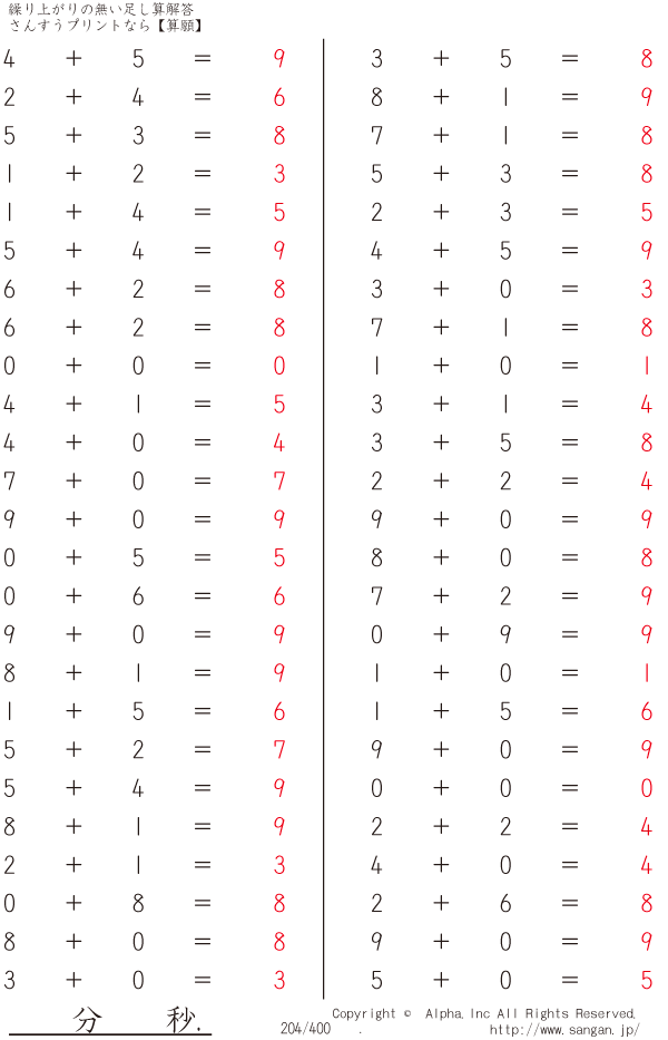 上記のボタンから「繰り上がりの無い足し算」の算数数学ドリル・計算ドリル(PDFプリント)がダウンロードできます。個人利用は無料です(家庭以外での配布は有料です)。